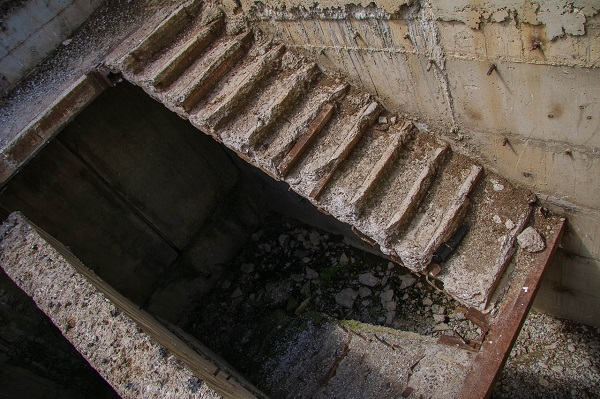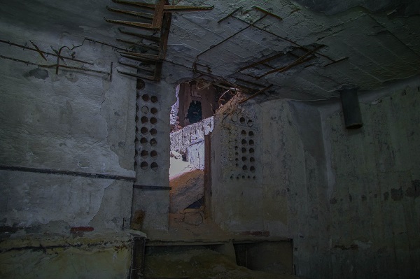 Верхний этаж служил для размещения командных, жилых и складских помещений, а также там располагалась вентиляция и туалеты с душевыми. Пострадал он намного больше, чем нижний, служебно-технический, так как все стены здесь были из обычного кирпича, и их разнесли в ноль. На нижнем уровне был уже монолитный железобетон. Побродив вдосталь по вентиляционным отсекам, пофотографировав сохранившиеся трубы (на некоторых сохранились даже тягонапорометры), спустился по обрушившимся плитам вниз. Удобной металлической лесенки, характерной для первых позиций, здесь не сохранилось. Все это время мои спутники компактной кучкой перемещались где-то за стенами, не мешая мне снимать и гулять в свое удовольствие. Встретившись с ними наконец, по длинному коридору-потерне я направился к одной из пусковых шахт: