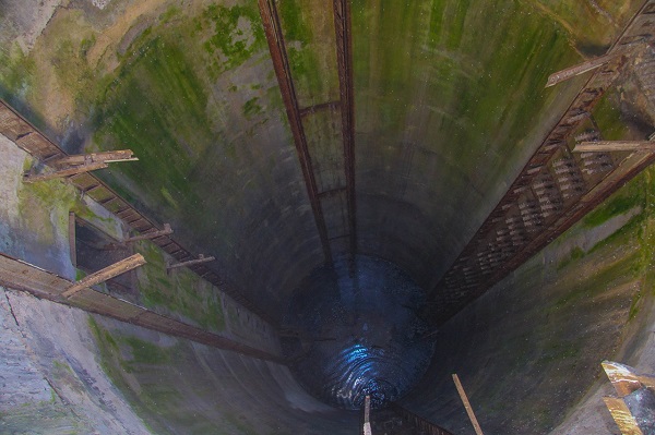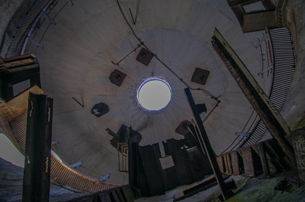 Несмотря на сохранившийся металлический балкончик вокруг шахты, фотографировать вертикальный ствол вниз страшновато и напряжно. Я очень боюсь высоты, гулкое гигантское помещение под многотонным бетонным колпаком шахты резонирует от хлопанья птичьих крыльев, ведь там полно голубей, а распалившееся воображение рисует мне ужасающую картину того, как с протяжным скрежетом прогнившие мостки отделяются от стены стакана, увлекая меня вниз, в темную густую жижу. Пернатых жителей много и здесь, они гнездятся на балках, в многочисленных люках и технологических отверстиях, повсюду кучи их помёта, перьев и даже целых трупиков. Брезгливым людям, боящимся замараться о птичье гуано, не место в таких местах.