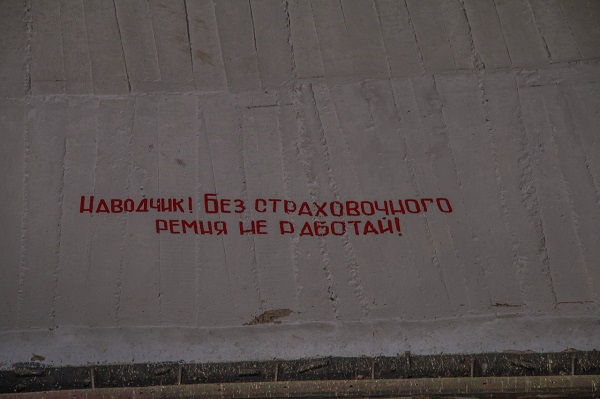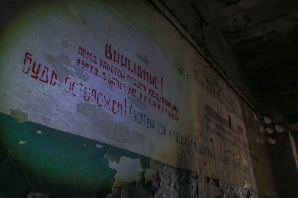 Смотреть тут особенно было не на что, и я перешел к ангару для регламентных работ. Когда-то он был разделен кирпичными перегородками на много отсеков, но сейчас их все снесли, а кирпичи убрали и расчистили, о былом количестве комнат напоминают только стены и потолок, покрашенные в разные цвета на разной высоте. Посреди ангара осталась торчать одна массивная бетонная опора, которую, видимо, поленились ломать. Самой интересной фишкой этого сооружение было наличие сохранившихся надписей, повествующих о том, как правильно обслуживать ракету, грузить ее и эксплуатировать. Сфоткал наиболее интересные и полные надписи, может когда-нибудь для истории пригодятся: