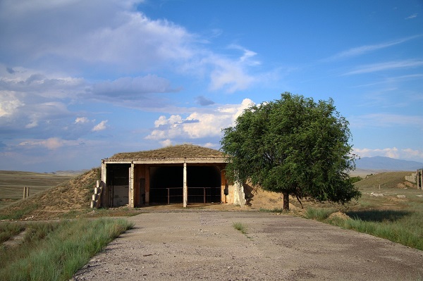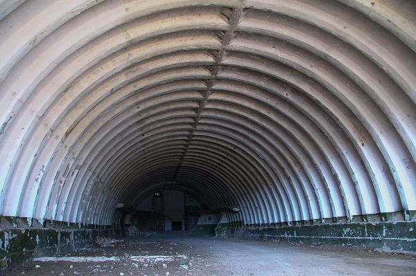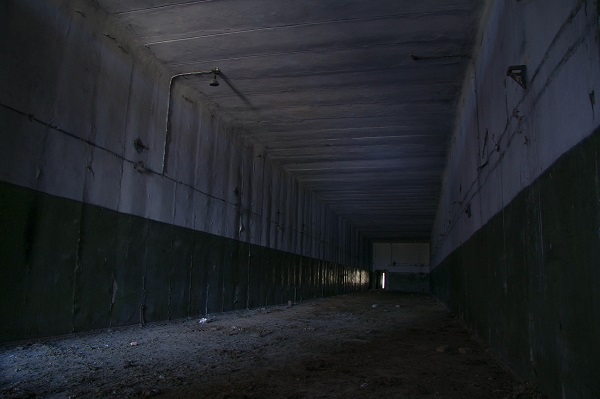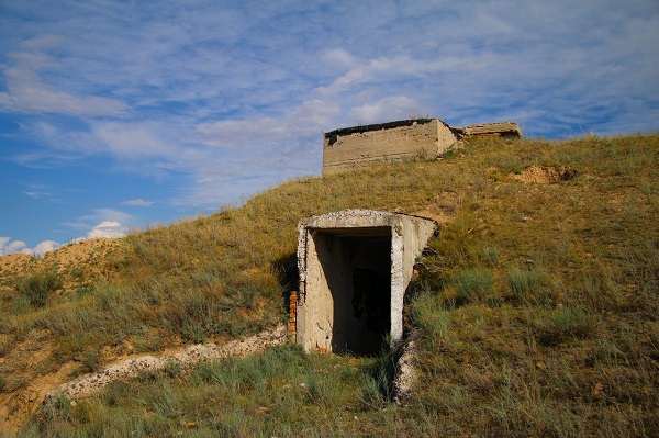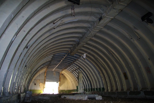 Группа сооружений на фото выше – это мощные хранилища для готовых изделий, погруженных на транспортно-заряжающие машины и ждущих, чтобы их отвезли и установили в шахты. Защищены эти хранилища толстенными железобетонными раздвижными створками, убирающимися в специальные пазы в стенах. А еще там приятное гулкое эхо, чистый и ровный бетонный пол и аварийный выход, некогда снабженный гермодверью, из каждого такого хранилища. В настоящее время это единственные сооружения на позиции, пока никак не использующиеся местными под законы или склады сена.