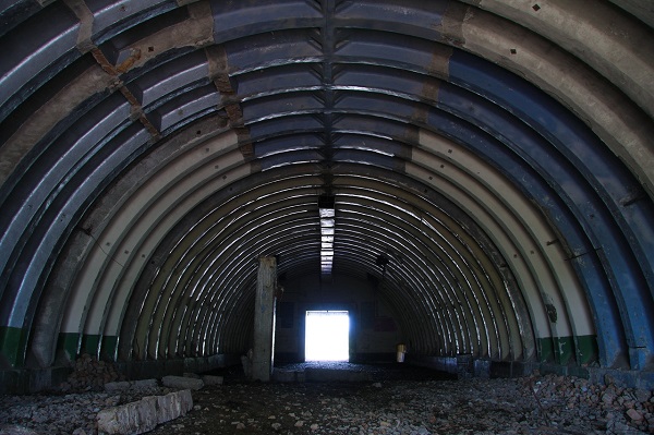 Один из двух маленьких бункеров, стоящий у дороги, был заботливо очищен от земляной обваловки и превращен в склад/сарай. Но при этом не варварски раскидан, а вся снятая земля ровным слоем распределена вокруг. На обнажившемся помещении была возведена крыша их плексигласа. На косяк, оставшийся от гермодвери, установлена обыкновенная дверь. Практически все ангары, кроме хранилищ готовых снаряженных ракет, были снабжены сварными калитками, приваренными к косякам опять же гермодверей либо гермоворот. Весь мусор, десятилетиями копившийся внутри, был аккуратно вычищен, полы подметены до голого бетона. Причем весь битый кирпич и куски плит не просто вытащены из ангаров и брошены, отнюдь нет – их аккуратно засыпали и утрамбовали в любую мало-мальски крупную яму на территории, а сверху присыпали землей. Тем самым через год-другой вся локация будет покрыта ровной травой, никаких колдобин и уродливых траншей от выкопанного кабеля и труб! Вдобавок, исторический облик ангаров и их внешний вид никак не пострадал. Хочется верить, что эти очищенные помещения, превращенные в загоны для скота, останутся доступными для посещения и впредь, как и сама локация. А пока посмотрим фото: