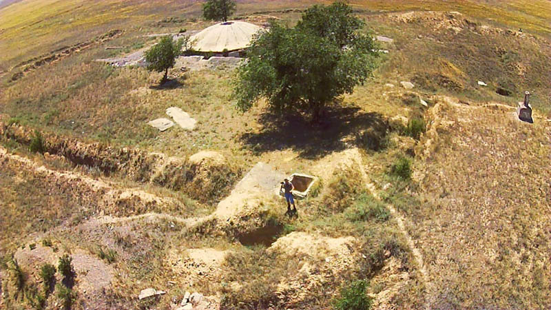 While the guys were setting up camp I walked around the territory making sure we were alone. I found the slanted entrance, half-covered with soil and a narrow manhole leading inside. Pooh launched a quadrocopter and made a few photos from above, including one of me near the manhole. The quality was not on par with my camera, but the angles are definitely cool enough to be added to the story here: