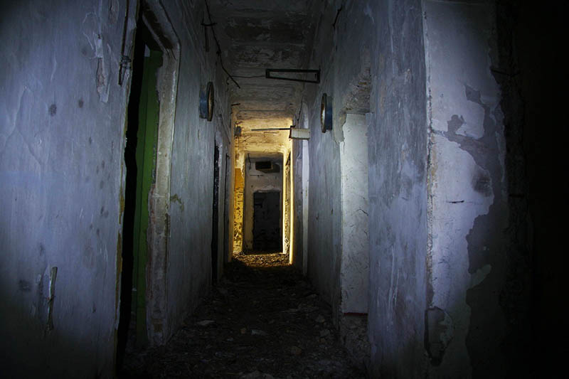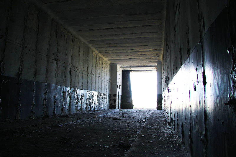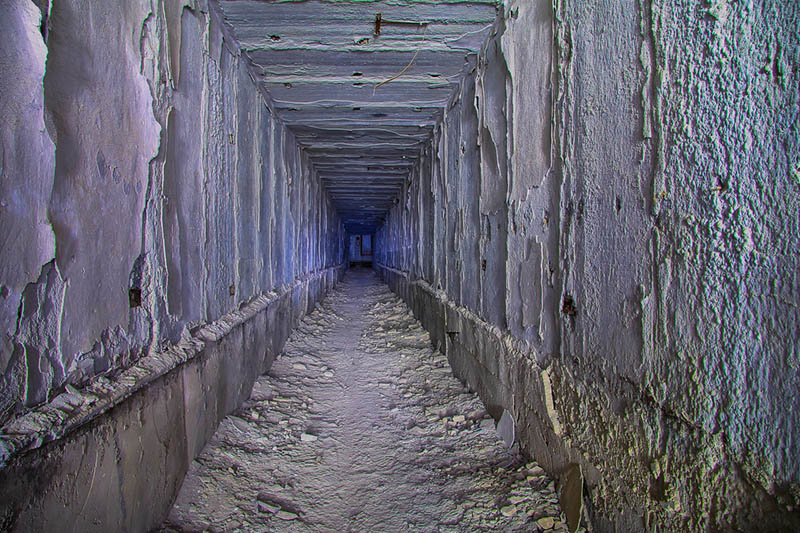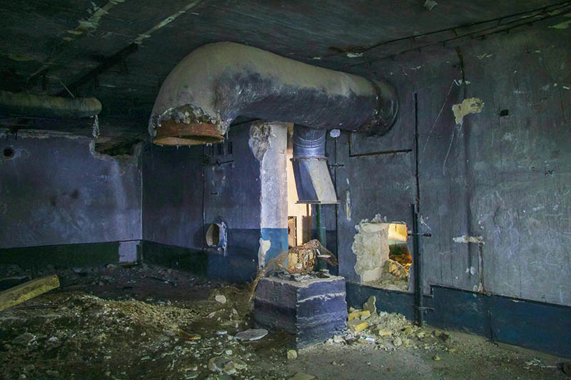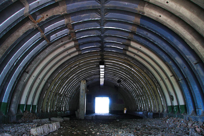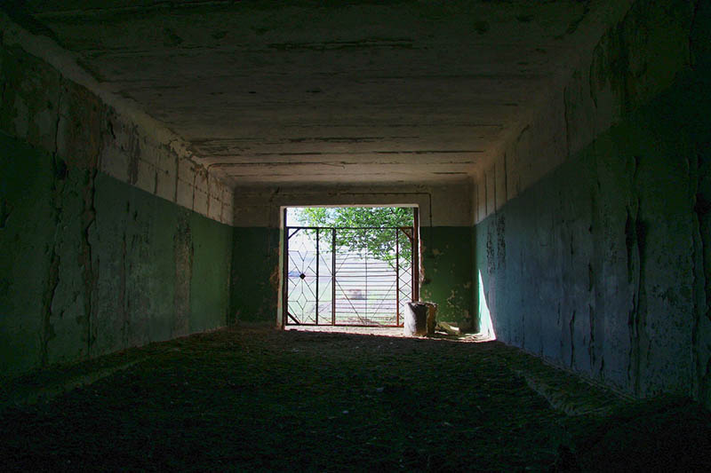 The group of structures in the photo above is an impressive storehouse for finished products immersed in transport-loading machines and waiting to be transported and installed in mines. These storages are protected by thick reinforced concrete sliding doors, which are retracted into special grooves in the walls. And then there's a pleasant echoing boom, a clean and even concrete floor and an emergency exit, once equipped with hermetic doors, out of each such storage. Currently, these are the only structures in the complex not yet used by locals for hay stores.