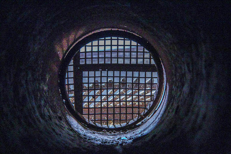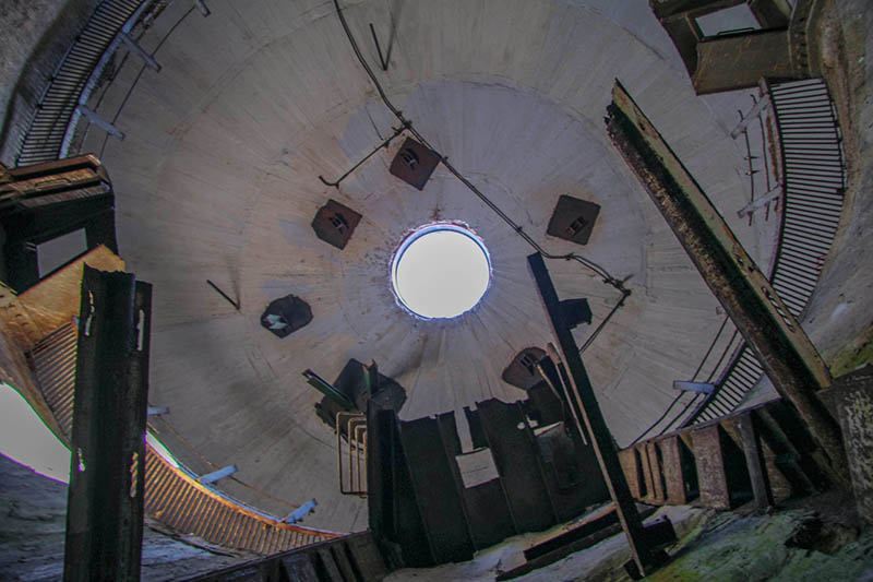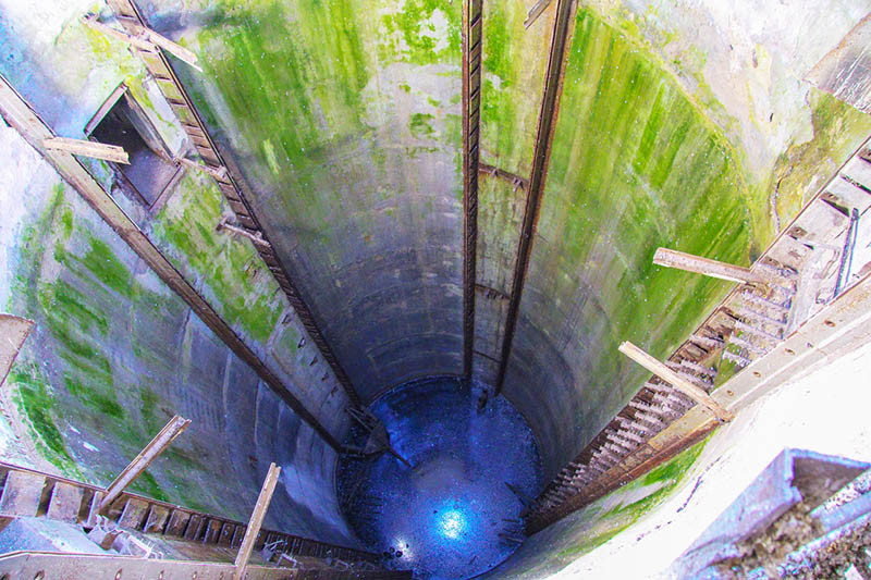 Despite the preserved metal balcony around the mine, photographing the vertical trunk downward is scary and stressful. I'm very afraid of heights, the booming giant room under the multitone concrete hood of the mine resonates from the flapping of the bird's wings, because there are full of pigeons, and the furious imagination paints me with a horrifying picture of how the rotting bridges separate from the wall of the glass with a screeching grin, dragging me down into the dark thick slurry. There are a lot of feathered inhabitants here, they nest on the beams, in numerous manholes and technological crevices, everywhere are piles of their litters, feathers and even whole corpse. Squeamish people won’t feel comfortable in there.