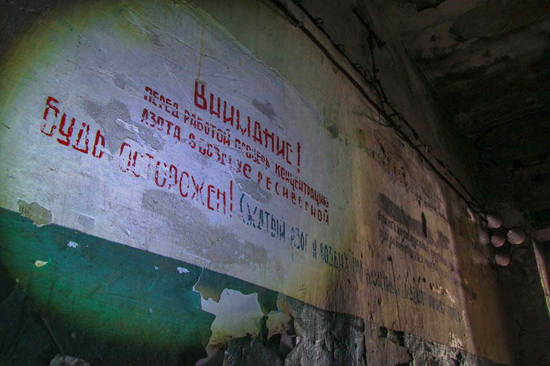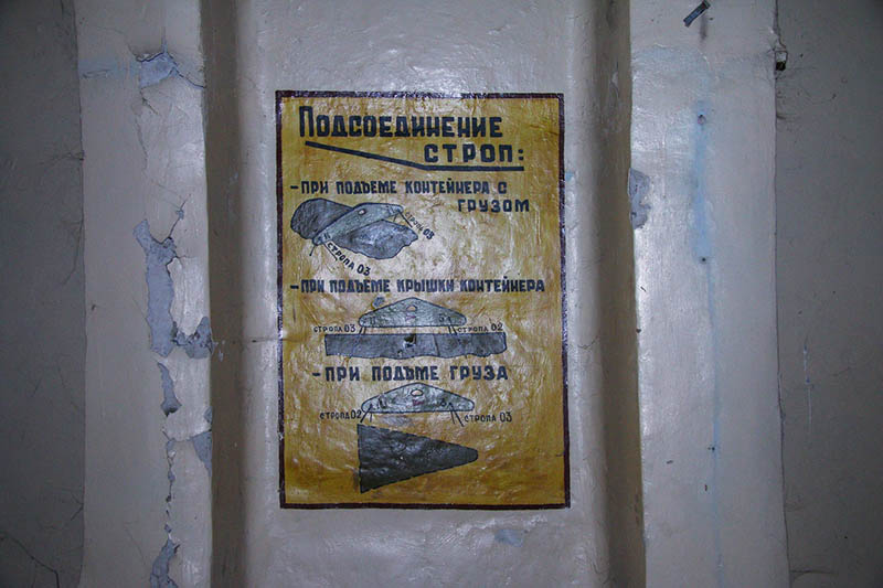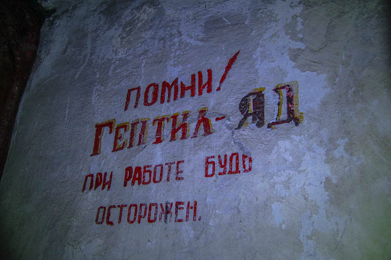 There was not much to see here, and I went to the hangar for routine maintenance. Once it was divided by brick partitions into many compartments, but now they were all demolished, and the bricks were cleaned and cleared, only the walls and the ceiling, painted in different colors at different heights, remind of the former number of rooms. In the middle of the hangar there remained one massive concrete pillar, which, apparently, too lazy to break. The most interesting feature of this structure was the existence of surviving inscriptions telling how to properly service a missile, load it and operate it. Took pictures ofl the most interesting and complete inscriptions, they can come in handy someday: