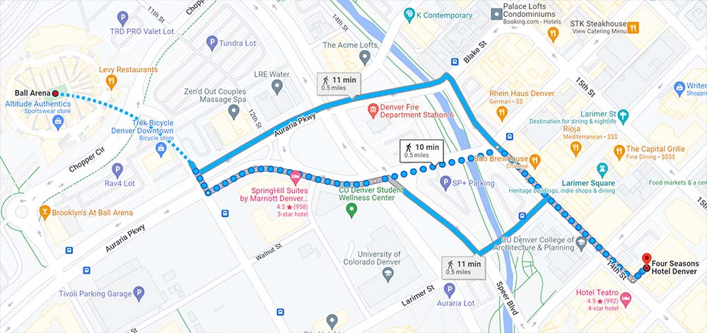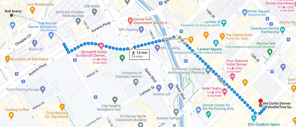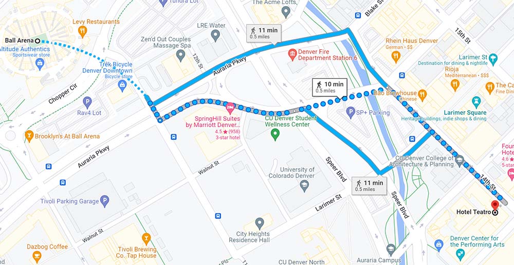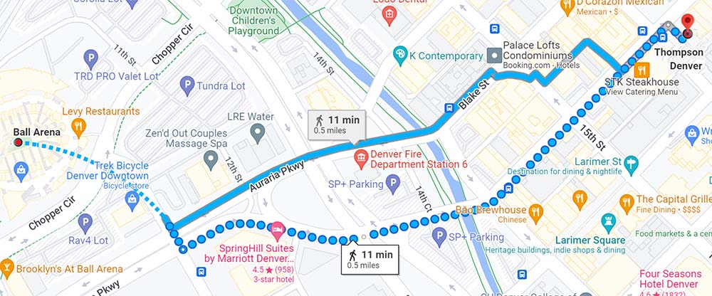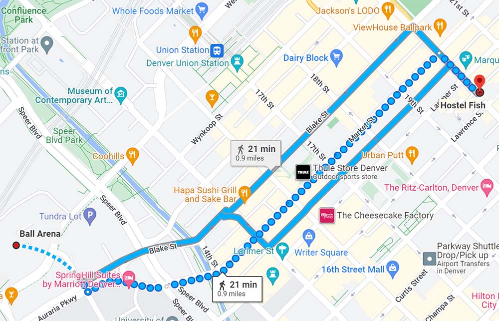 Located only 0.8 miles (1.3 km) away from Ball Arena, you can get there by foot in about 15 minutes.