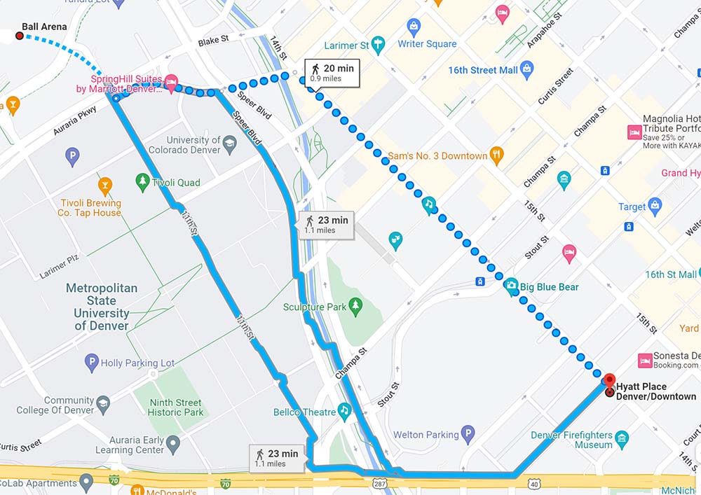 Located only 1 mile away from Ball Arena, you can get there by foot in about 25 minutes.