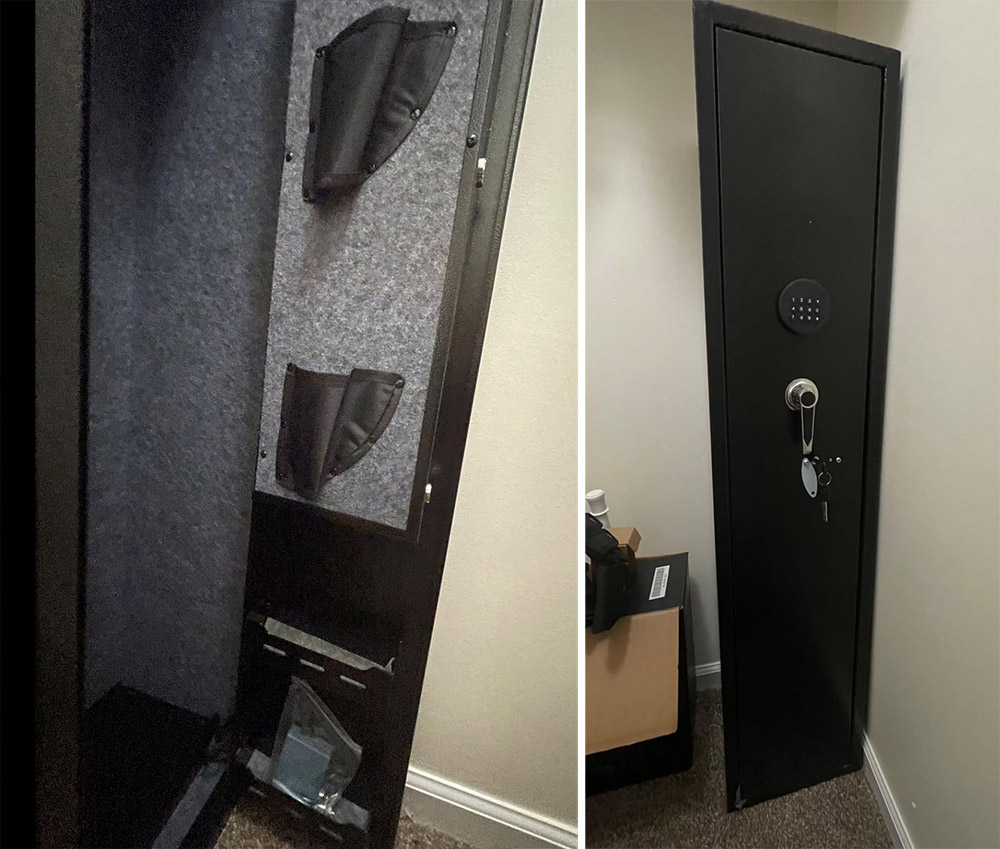 "The safe arrived promptly via FedEx, just a week after my purchase, and the packaging was impeccable, ensuring it arrived in pristine condition without a scratch or dent. It would have to endure severe mishandling during shipping to sustain any damage. This safe is ideal if you have a few rifles. Personally, I have one with a scoped rifle and another with a red dot scope, and they fit comfortably. The foam rubber barrel holder is robust and reliable.