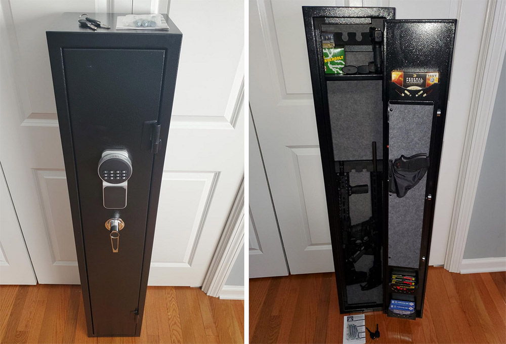 "Upon arrival, the safe was well-packaged and in good condition. It offers a removable top shelf and extra storage space on the door. Functioned flawlessly straight out of the box. The size suits my needs perfectly, and in this price range, it stands out as the best gun safe or cabinet. It boasts large locking pins, a heavy door, and an alarm system. My primary use is to secure my firearms from the curious hands of children. Moreover, it serves as a deterrent to casual intruders. With this safe, my weapons are now securely stored instead of just standing against the wall." — Jason Hughes