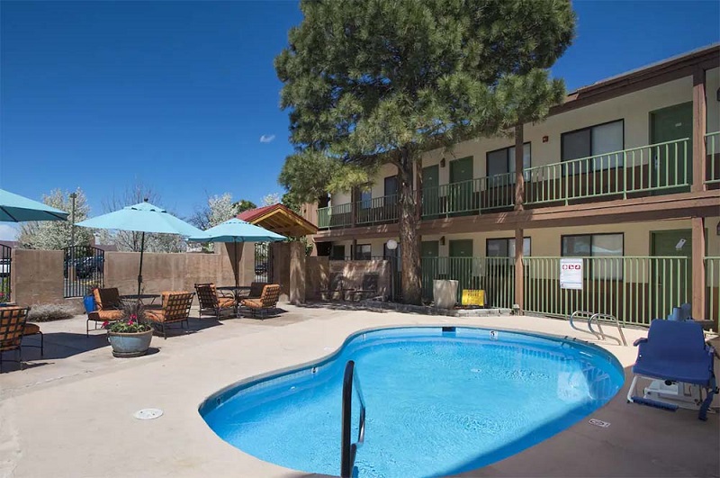 On a hill overlooking Santa Fe, New Mexico, It features an outdoor pool/hot tub, and free in-room WiFi.