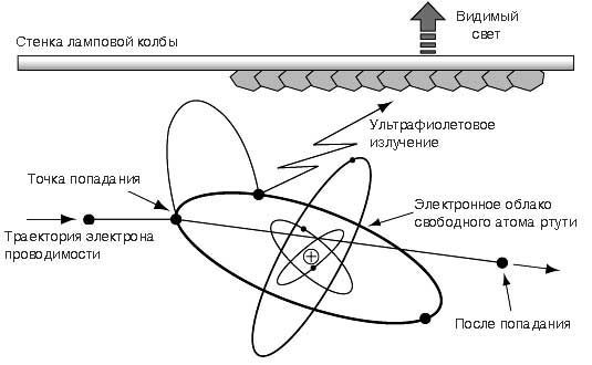 Люминесцентная лампа - это стеклянная трубка, покрытая изнутри слоем люминофора и заполненная разреженными парами ртути и инертным газом (например, аргоном). В торцах трубки расположены электроды. Когда на них воздействует высокое электрическое напряжение, в лампе возникает газовый разряд. Проходящий через пары ртути ток вызывает ультрафиолетовое излучение. Ультрафиолет заставляет светиться люминофор.