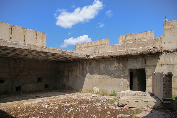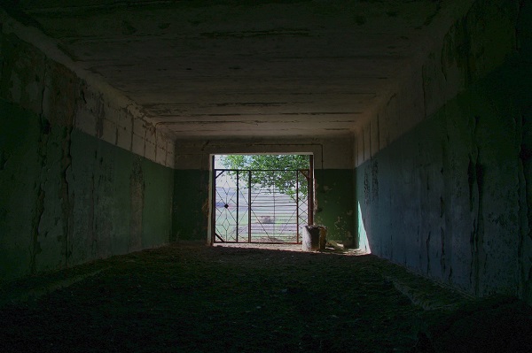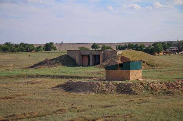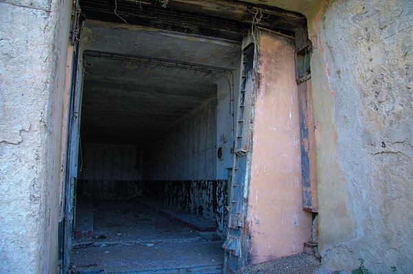Группа сооружений на фото выше – это мощные хранилища для готовых изделий, погруженных на транспортно-заряжающие машины и ждущих, чтобы их отвезли и установили в шахты. Защищены эти хранилища толстенными железобетонными раздвижными створками, убирающимися в специальные пазы в стенах. А еще там приятное гулкое эхо, чистый и ровный бетонный пол и аварийный выход, некогда снабженный гермодверью, из каждого такого хранилища. В настоящее время это единственные сооружения на позиции, пока никак не использующиеся местными под законы или склады сена.