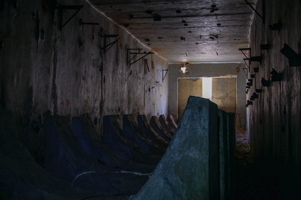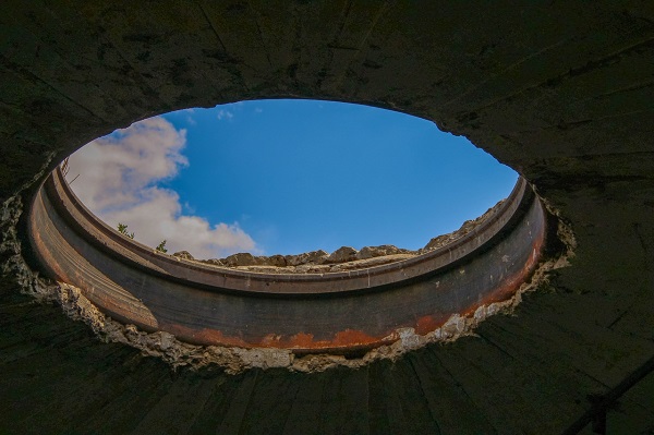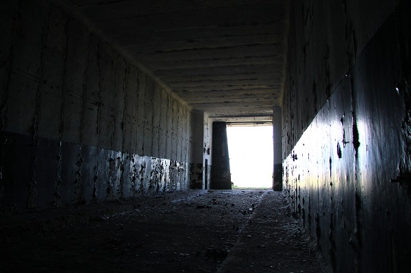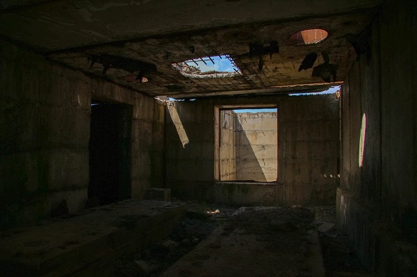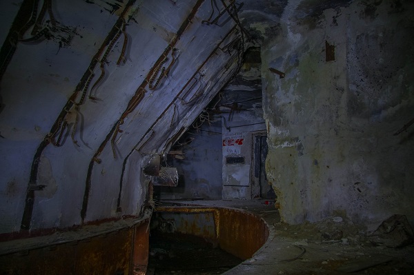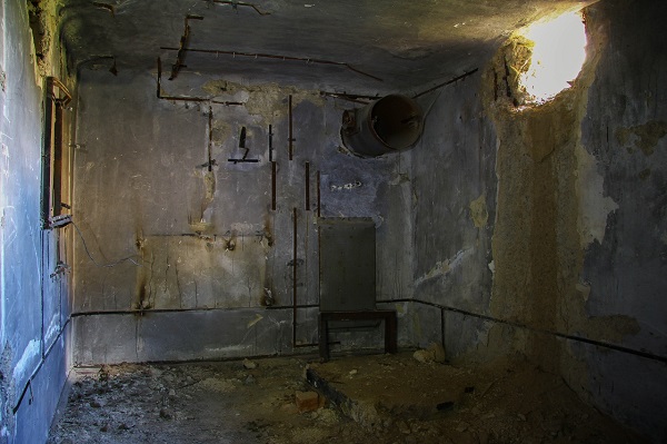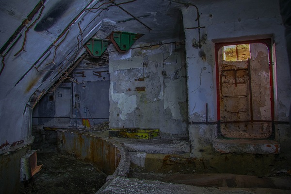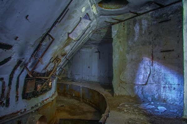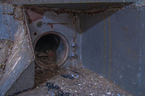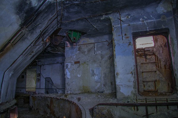 Верхний этаж служил для размещения командных, жилых и складских помещений, а также там располагалась вентиляция и туалеты с душевыми. Пострадал он намного больше, чем нижний, служебно-технический, так как все стены здесь были из обычного кирпича, и их разнесли в ноль. На нижнем уровне был уже монолитный железобетон. Побродив вдосталь по вентиляционным отсекам, пофотографировав сохранившиеся трубы (на некоторых сохранились даже тягонапорометры), спустился по обрушившимся плитам вниз. Удобной металлической лесенки, характерной для первых позиций, здесь не сохранилось. Все это время мои спутники компактной кучкой перемещались где-то за стенами, не мешая мне снимать и гулять в свое удовольствие. Встретившись с ними наконец, по длинному коридору-потерне я направился к одной из пусковых шахт: