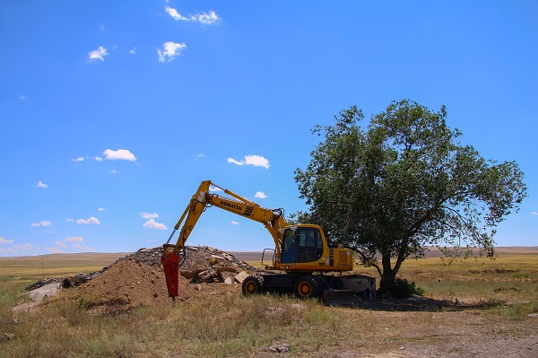 На шахтах нас ждал большой и желтый неприятный сюрприз в виде китайского экскаватора с пикой-долбилкой по бетону. Экскаватор стоял посреди груды произведенных им же разрушений, вокруг валялись куски массивного железа, вывороченные из купола шахты, в тени расположился импровизированный лагерь разрушителей, кострище, бутыли с водой. На наше счастье, сами работники лома и болгарки куда-то отлучились, и мы, шепча проклятия личностям, разрушающим последнее, ради чего еще стоит мотаться в такую даль, стали осматриваться и готовиться к спуску вниз: