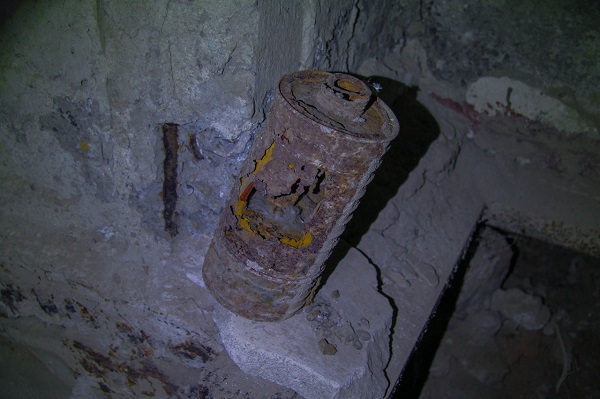 По пути встретился очень интересный фильтр для противогаза, никогда не встречал такого. Большой фрагмент сверху похож на стандартный ЕО-16 (Единый Общевойсковой), цвета хаки, увеличенную армейскую версию этого вашего ГП-5, а снизу в него был вкручен еще один фильтр поменьше, вроде как зеленого цвета. Видимо, тут либо кустарные поделки солдатни (хотя резьбовое соединение большого и малого фильтра выглядит заводским), либо мы нашли редкий фильтр для работы в гептил-содержащей среде, так как именно этим компонентом были наполнены цистерны в подземном комплексе.