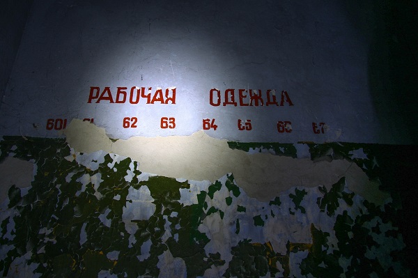 Смотреть тут особенно было не на что, и я перешел к ангару для регламентных работ. Когда-то он был разделен кирпичными перегородками на много отсеков, но сейчас их все снесли, а кирпичи убрали и расчистили, о былом количестве комнат напоминают только стены и потолок, покрашенные в разные цвета на разной высоте. Посреди ангара осталась торчать одна массивная бетонная опора, которую, видимо, поленились ломать. Самой интересной фишкой этого сооружение было наличие сохранившихся надписей, повествующих о том, как правильно обслуживать ракету, грузить ее и эксплуатировать. Сфоткал наиболее интересные и полные надписи, может когда-нибудь для истории пригодятся:
