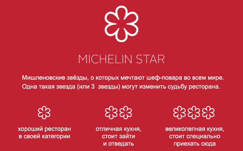 Одна звезда - это уже очень и очень хорошо. Это значит, что ресторан обладает отменной кухней в своей категории, и по пути в него стоит заглянуть. Две звезды - признак отличной кухни, и повод отклониться от намеченного маршрута. Три звезды - фантастическое мастерство повара заслуживает того, чтобы только ради еды отправиться в путешествие. В «Красном гиде» содержатся и другие полезные обозначения, и их гораздо больше, чем звезд, так как за высшие награды могут бороться только заведения с авторской кухней. Если у кафе нет шеф-повара или эта должность номинальная, на звезду нечего и рассчитывать.