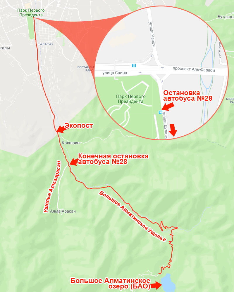 Автобус № 28 начинает свой путь от улицы Навои, около парка Первого Президента и довезет до конечной остановки – Большое Алматинское ущелье. Такой вид транспорта выгоден тем, что на эко-посту пропускают без остановки и с пассажиров не требуют экологический сбор.