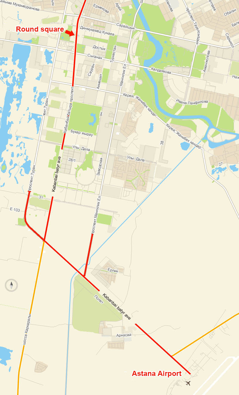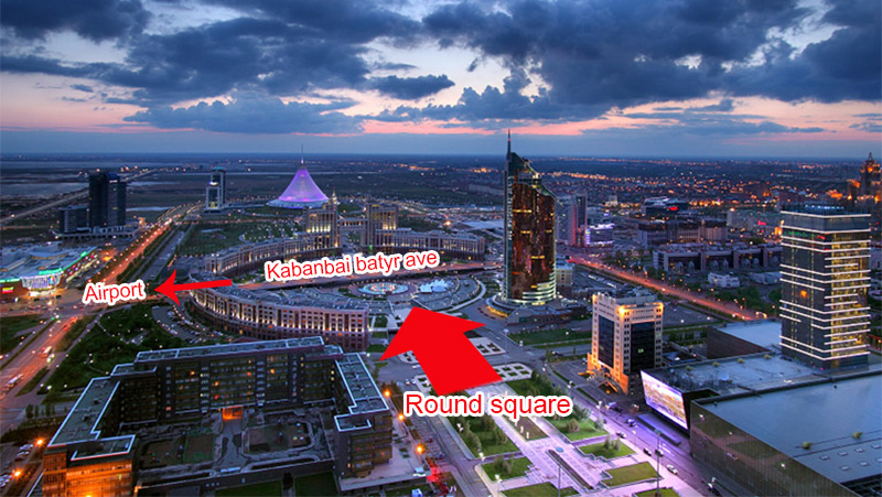 Astana Airport is only 14 km from the city, if you count from the main square, called the "Ashtray" by locals (the square received its name for its round shape). To get from there to the airport, you need: