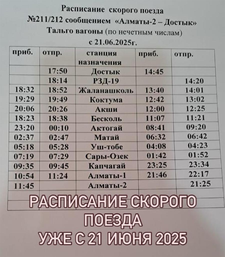 ✅ Поезд №211/212 Алматы - Достык ("Тальго") будет курсировать через день;