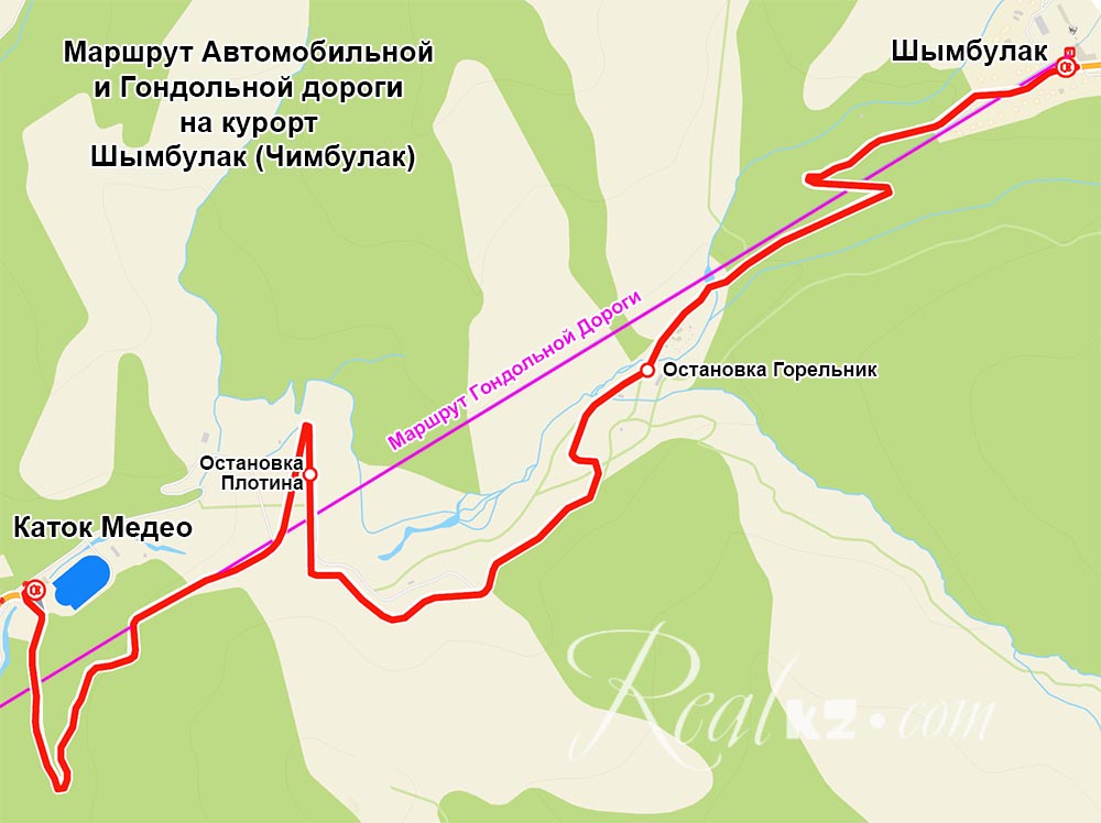 Канатная дорога к Шымбулаку начинается от Медео. Станция находится ниже катка на 500 метров. К ней можно добраться двумя способами.