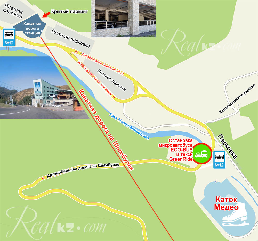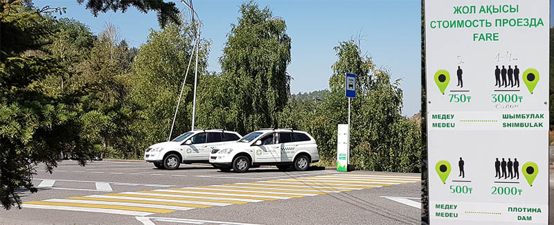 Для таких путешественников предусмотрены специальные эко-автобусы и такси (работающие не на двигателе внутреннего сгорания). Они курсируют между Медео и Шымбулаком. Чтобы воспользоваться ими, выйдите на конечной остановке автобуса №12 или доберитесь до нее на своем авто. Затем вы сможете оставить машину на парковке и пересесть на эко-автомобиль. Все машины отправляются прямо от парковки, расположенной у входа на каток.