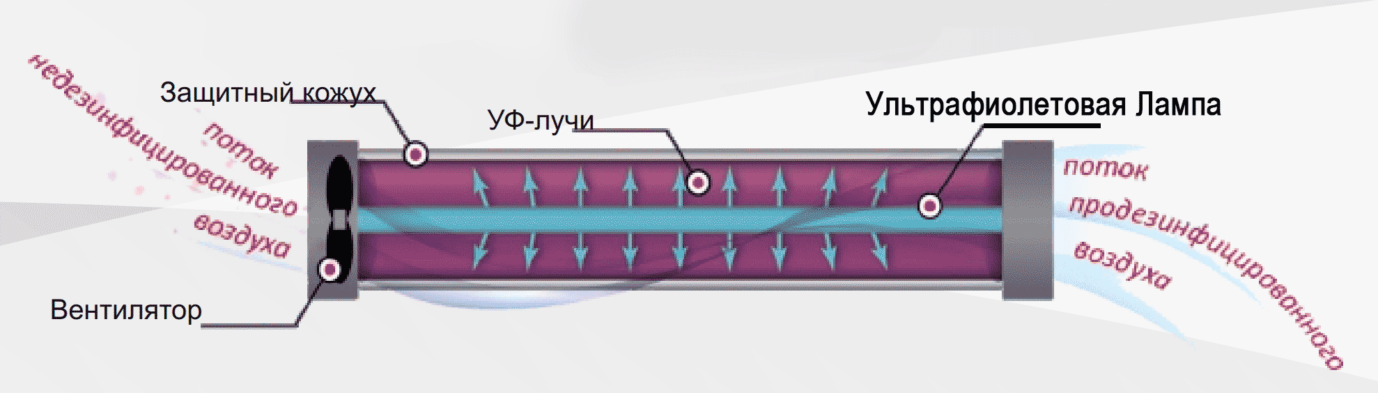 Под воздействием УФ волн короткого диапазона (180-315 нм) на поверхностях и в воздухе погибают все микроорганизмы, имеющие инфекционную природу (споры, грибки, плесень, бактерии и вирусы). Это связано с тем, что молекулы ДНК-цепи микробов поглощают долю УФ-лучей, погибая или же прекращая размножение (включая короновирус SARS-CoV-2!).