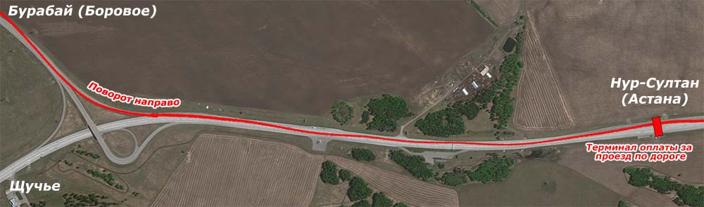 Чтобы выехать на автобан и взять курс на Щучинск, необходимо двигаться в северную часть города Астаны по улице Ондерис. Следуя по ней в северном направлении, вы проедете развязку и окажетесь на трассе А1. После развязки через один километр вы подъедете к воротам и терминалу. На выезде из города оплачивать проезд не нужно, на терминале просто отсканируют номер машины (оплата в конце маршрута). Выехав на трассу А1, двигайтесь прямо 212 км до терминала, где нужно оплатить проезд до Щучинска. После оплаты на развязке за один километр перед развязкой на Щучинск поверните направо по первому съезду.