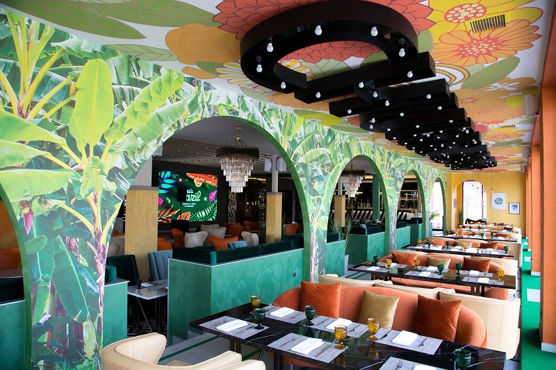 Очень красивое место с просторной летней площадкой, с которой открывается шикарный вид на горы. В меню преобладают блюда восточной и европейской кухонь (всего их 162). Гостей развлекает приятная фоновая музыка, для желающих потанцевать предусмотрен танцпол. Зал достаточно большой, вмещает 600 человек и идеально подойдет для проведения торжеств, свадеб и корпоративов. Для тех, кто хочет посидеть в более спокойной обстановке, есть отдельная VIP-комната.