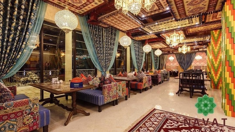 Готовят в «Навате» как дома. К заказу доступны блюда европейской, восточной и казахской кухни. Также есть шашлыки и детское меню. Среди самых популярных блюд можно выделить вегетарианский дәмді, ганфан по-домашнему, праздничную дымляму, куырдак из куриных голеней. При желании любую позицию можно заказать на дом или в офис с бесплатной доставкой. Примерная цена – от 6 тыс. тенге с человека. Среди других особенностей чайханы – фоновая музыка, летняя терраса, Wi-Fi, общественная стоянка.