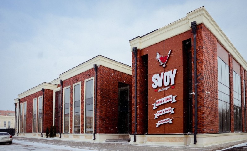 В «SVOY» подают европейские и восточные блюда по демократичным ценам. На первом этаже комплекса размещается пивной паб с большой сценой и собственной пивоварней. Второй принадлежит винно-пивному ресторану. Третий занимают караоке и ВИП-караоке залы. В теплый период на всех трех уровнях работают летние зоны. На территории заведения бесплатно раздают Wi-Fi, для посетителей на автомобилях есть отдельная стоянка.