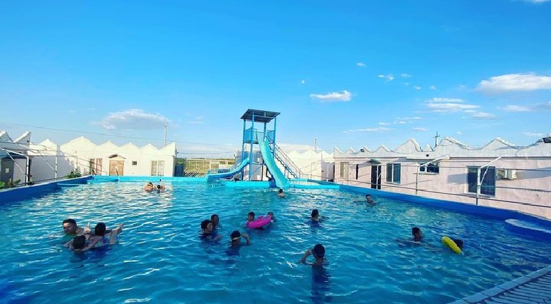На территории с шезлонгами, беседками и мангалами находятся три бассейна – для детей, закрытый и уличный. Вода в них теплая, есть большая аквагорка, игровая площадка, кафе, настольный теннис, бесплатная автостоянка. 2, 3, 4 и 6-местные номера оборудованы системами кондиционирования, кухней с холодильником, TV, туалетом, в домиках есть бильярд. Интернет работает стабильно, кормят вкусно, хотя и дорого. Цена с человека стартует от 7 000 тенге в будние дни и от 9 000 – в выходные. На осенние и зимние праздники возможно повышение цен, лучше бронировать заранее.