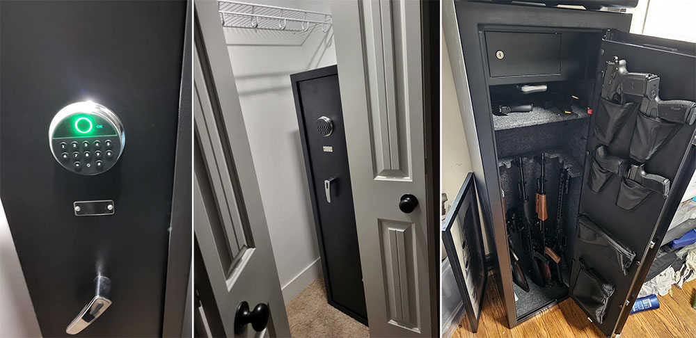 "I required a safe that fits snugly in my closet, allowing quick access while ensuring my firearms are secured for my use only. This safe isn't heavy-duty by any means; it won't stand up to a determined attempt to break into it. It's just the right size for my needs, accommodating one rifle, a home-defense pistol, and my EDC pistol (Hellcat micro). However, it won't fit scoped rifles comfortably. I turn my rifles sideways to fit, and larger pistols may prevent the door from closing due to their handles. Mounting it to the wall is necessary to prevent tipping, especially on carpet. If your purpose aligns with mine, this safe is perfect. If not, or if you're unwilling to bolt it to your wall, consider other options." — Kyle Trenton (This text is a condensed version of a real review from Amazon)