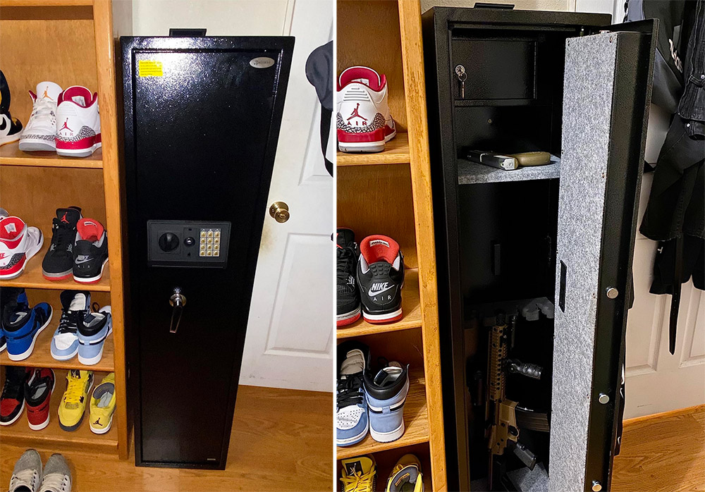 However, larger scoped rifles might need adjustments. It's not a heavy-duty safe or fireproof, but it fits my needs, keeping my firearms secure and away from my kids.
