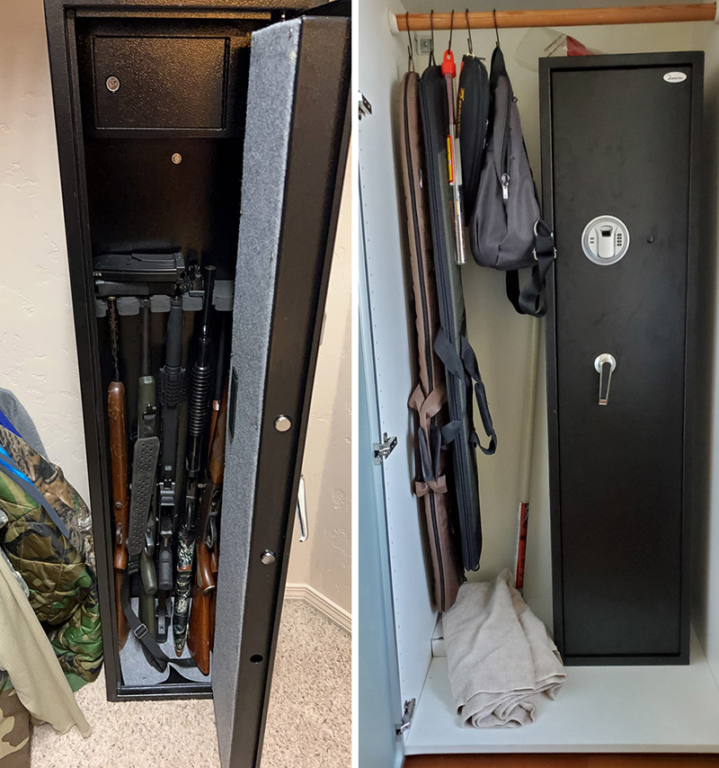 "Upon arrival, the safe was well-packaged and in good condition. It offers a removable top shelf and extra storage space on the door. Functioned flawlessly straight out of the box. The size suits my needs perfectly, and in this price range, it stands out as the best gun safe or cabinet. It boasts large locking pins, a heavy door, and an alarm system. My primary use is to secure my firearms from the curious hands of children. Moreover, it serves as a deterrent to casual intruders. With this safe, my weapons are now securely stored instead of just standing against the wall." — Jason Hughes