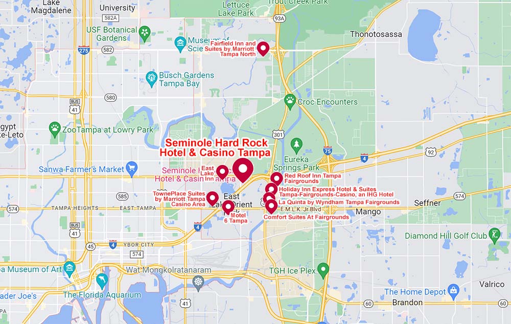 Seminole Hard Rock Hotel & Casino Tampa is a gaming complex and hotel that opened in 2004. It is located on the Tampa Reservation off of Interstate 4, just east of Tampa, Florida. The 190,000-square-foot casino has been expanded multiple times since its opening. It is a 24-hour venue that permits smoking indoors.