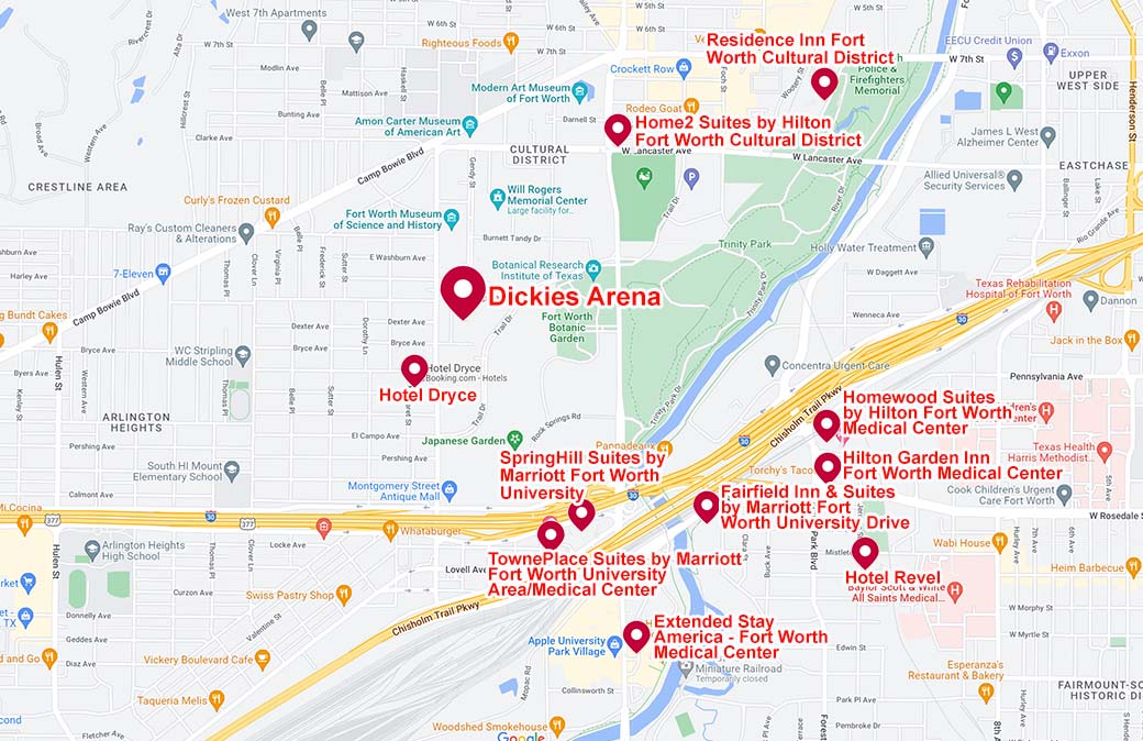 Dickies Arena is a 14,000-seat multipurpose American arena, located within the Will Rogers Memorial Center in Fort Worth, Texas. Dickies Arena is located at Harley Avenue and Gendy Street between Montgomery Street and Trail Drive in west Fort Worth. The adjacent Chevrolet Garage garage has 2,200 spaces on six levels.
